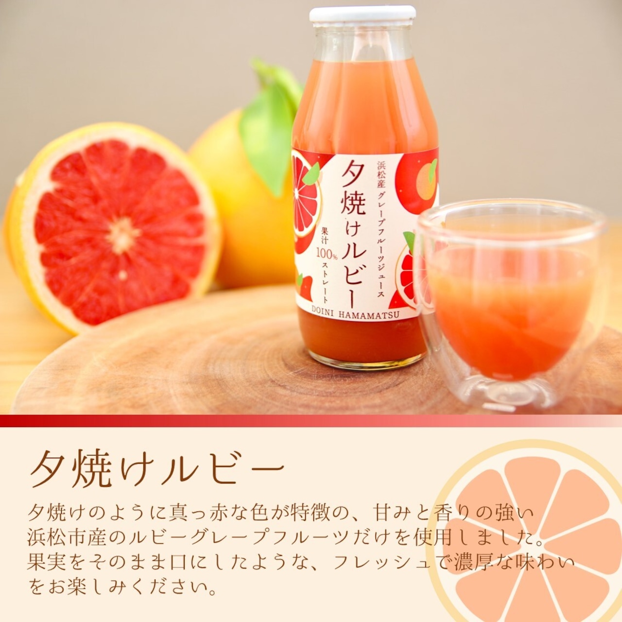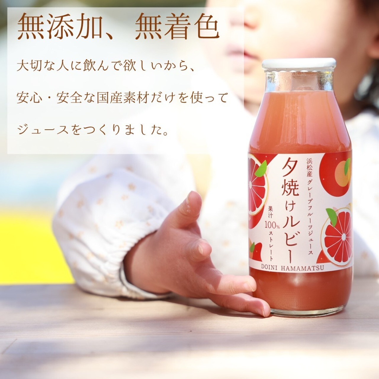 <夕焼けルビー> 濃縮還元なしの100%ストレートジュースです。スタールビー種のみを使用しています。栄養成分表示 1本分:熱量70.0kcal、タンパク質1.7g、脂質0.2g、炭水化物17.8g、食塩相当量0.0g、ビタミンC67.0mg